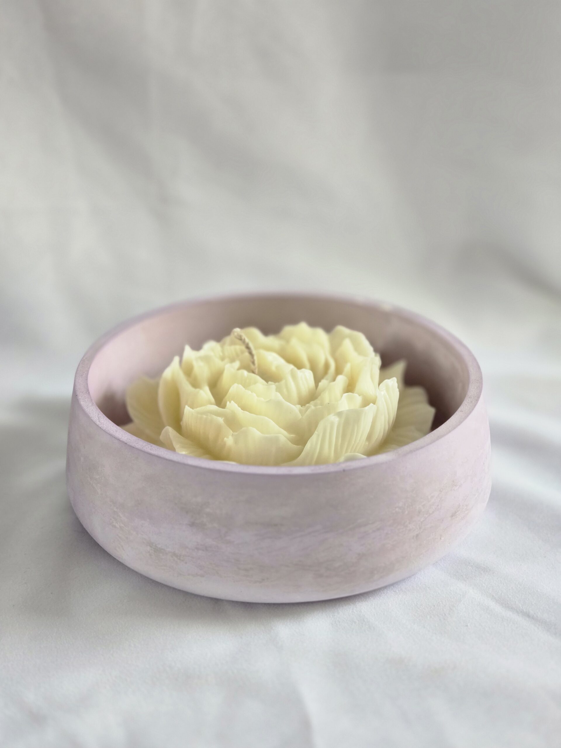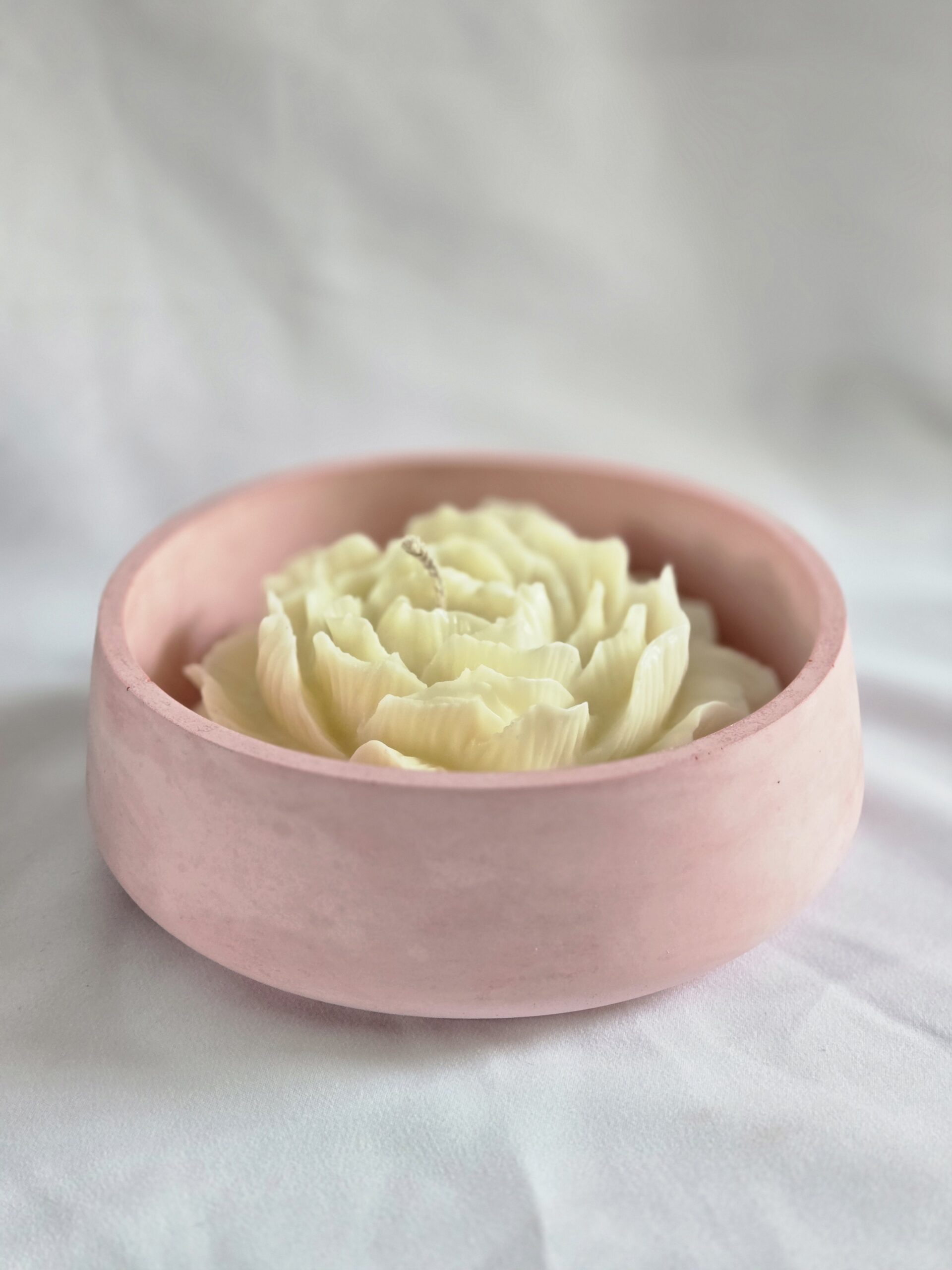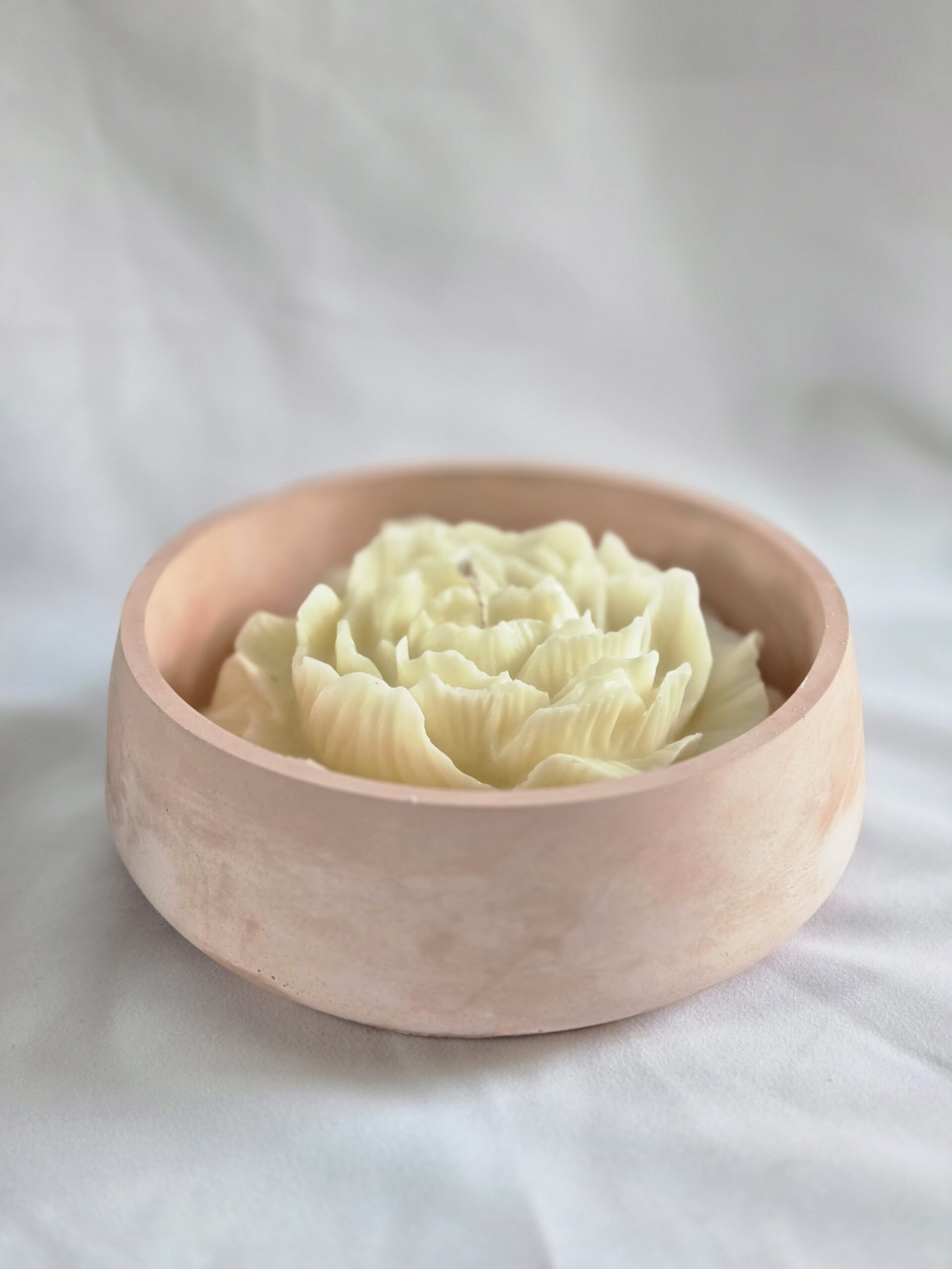 A luxurious handcrafted candle featuring a delicately sculpted peony flower in a modern cement bowl. Elegant, bold, and made to impress