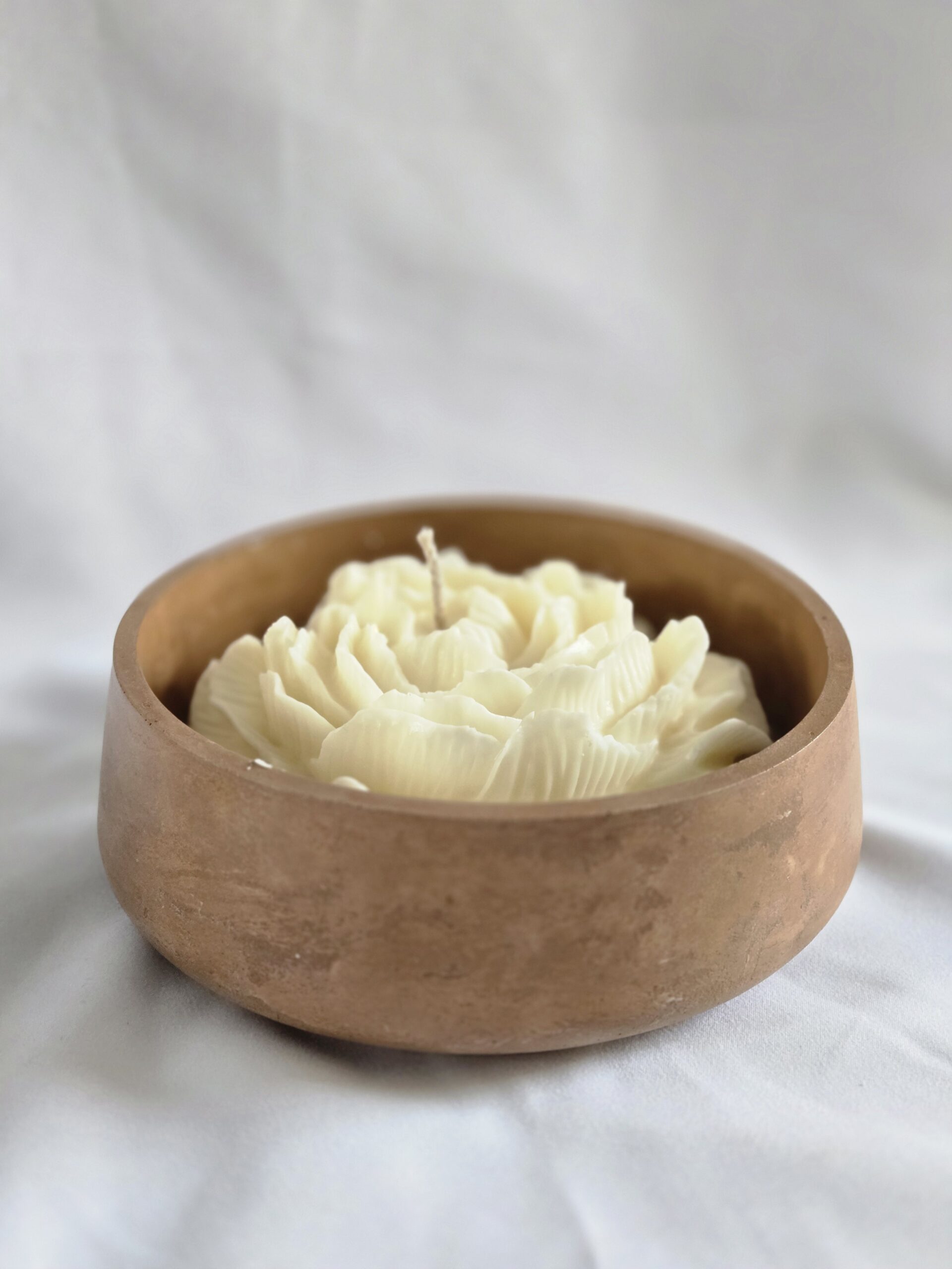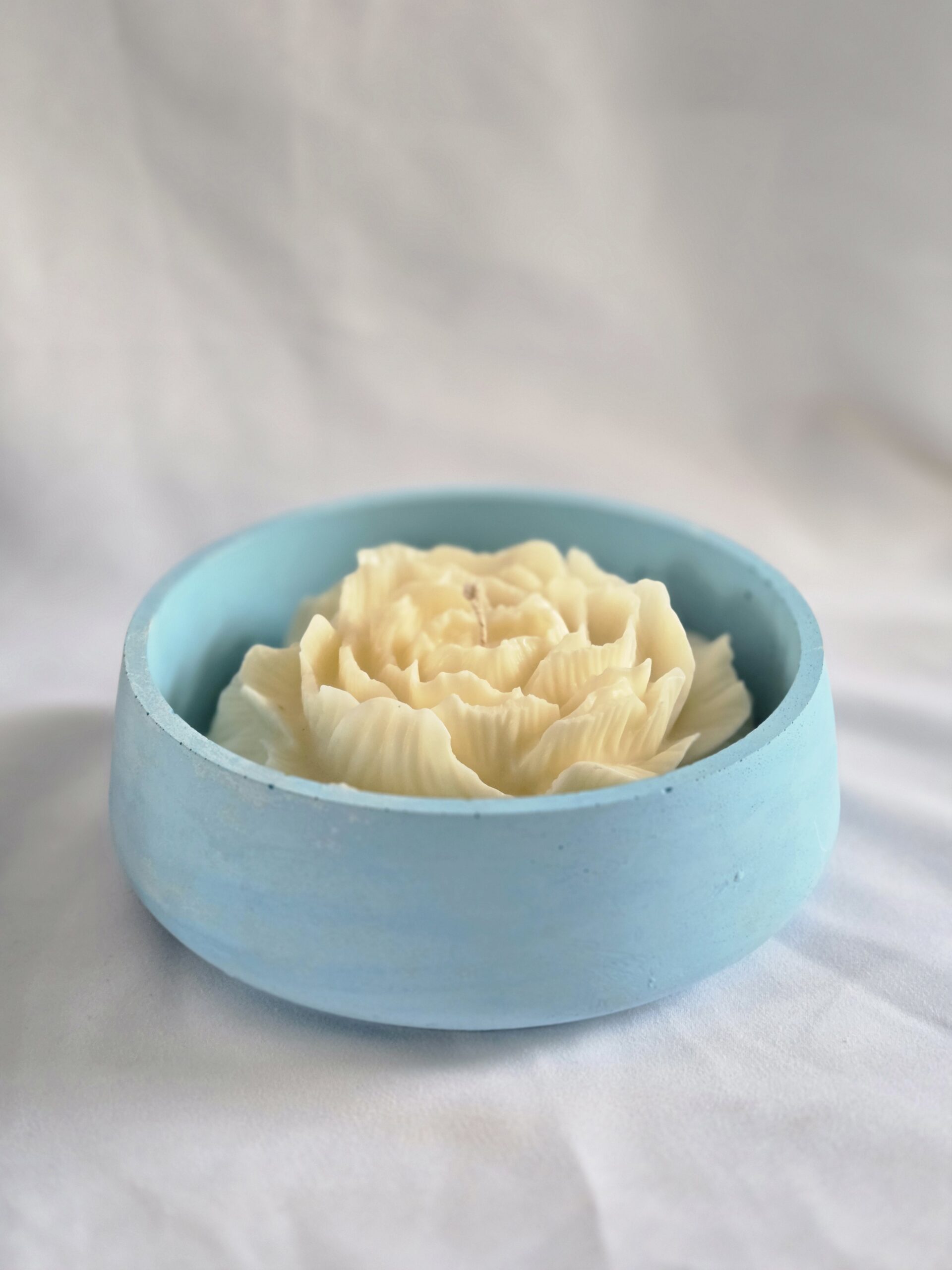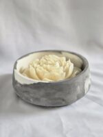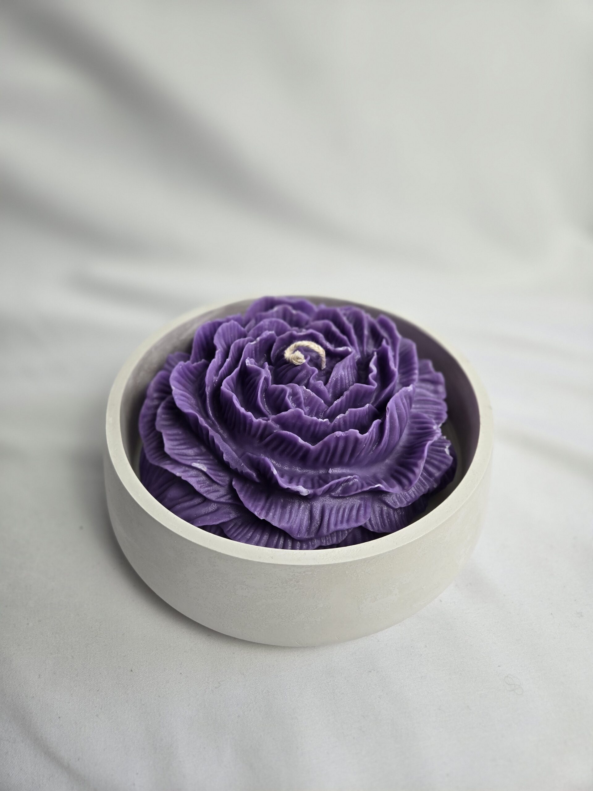 A luxurious handcrafted candle featuring a delicately sculpted peony flower in a modern cement bowl. Elegant, bold, and made to impress
