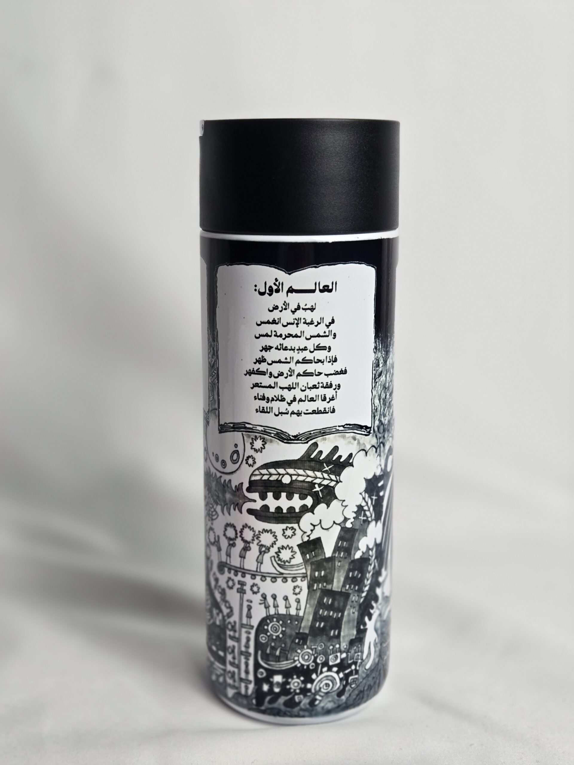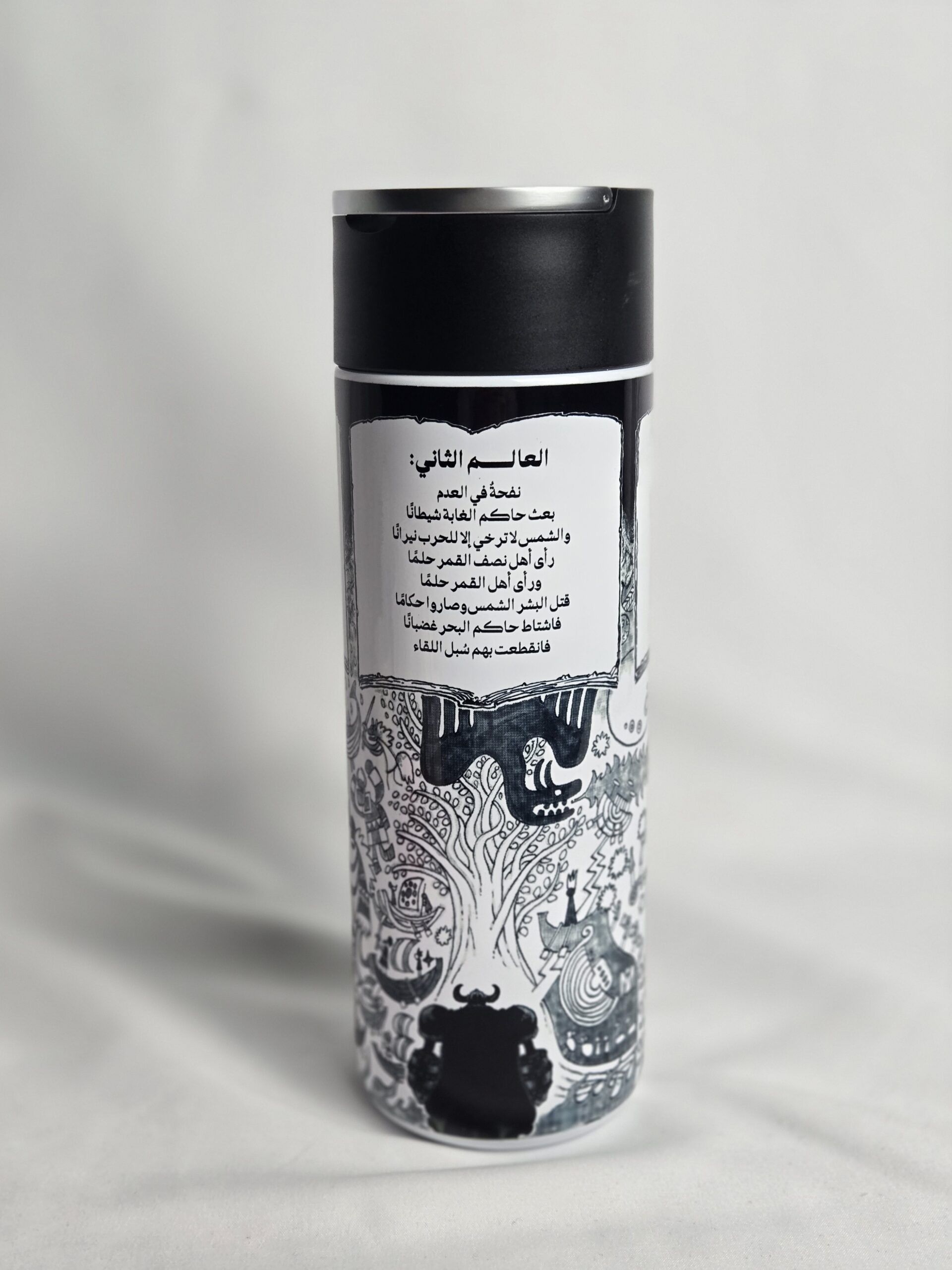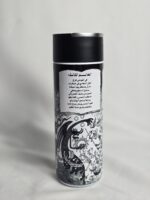 A double-wall stainless steel bottle with a sleek black lid, keeps drinks hot or cold while on the go.